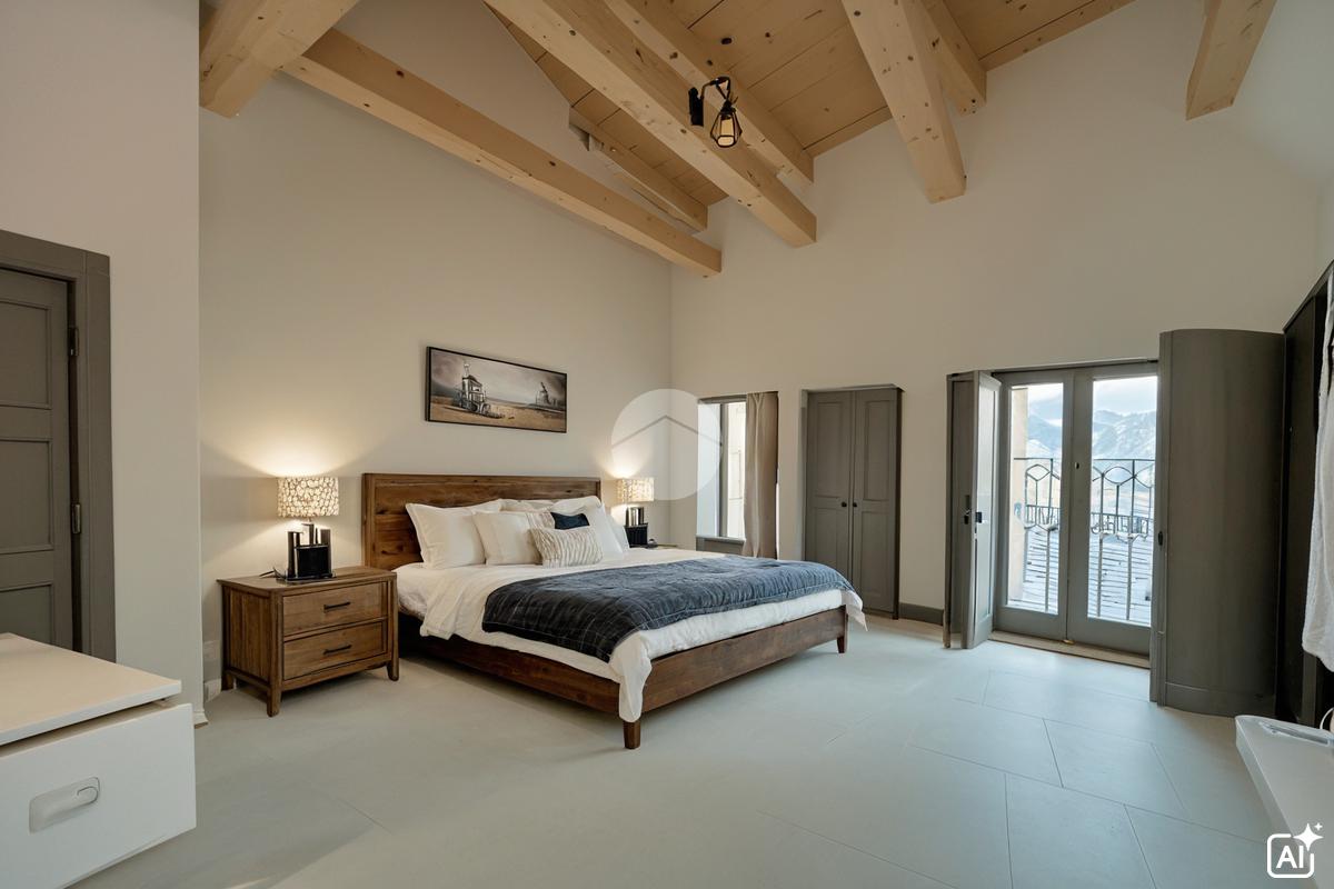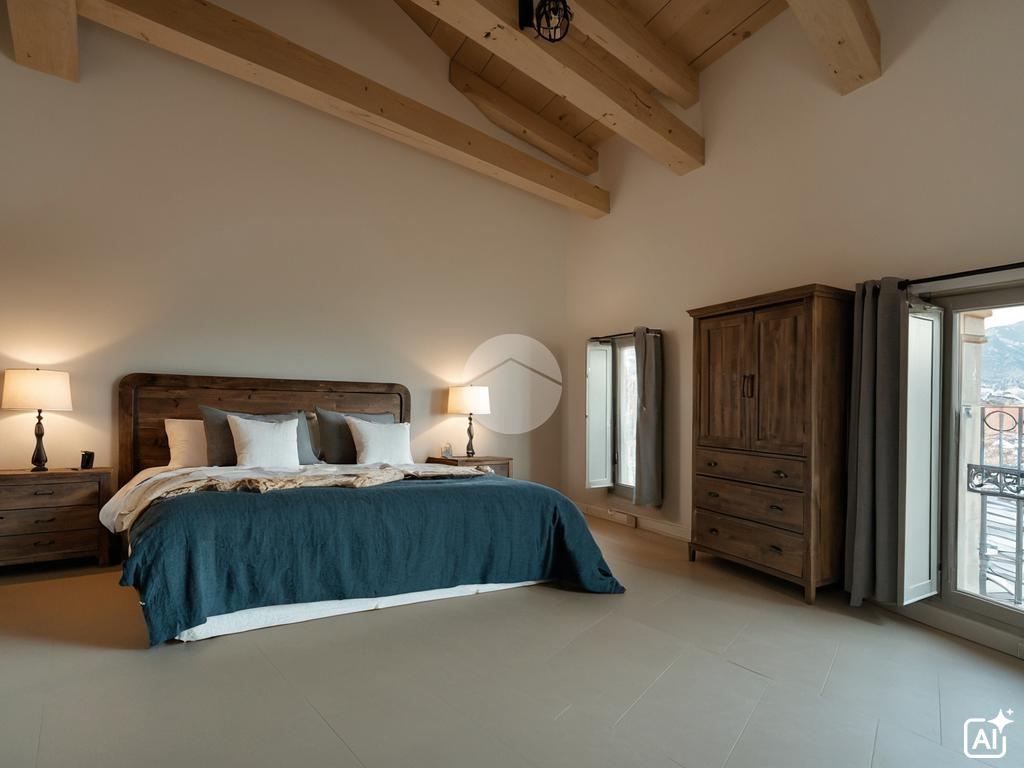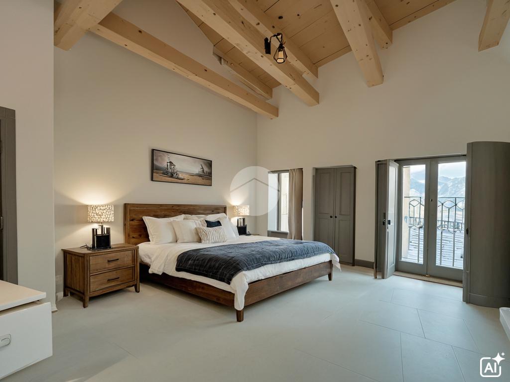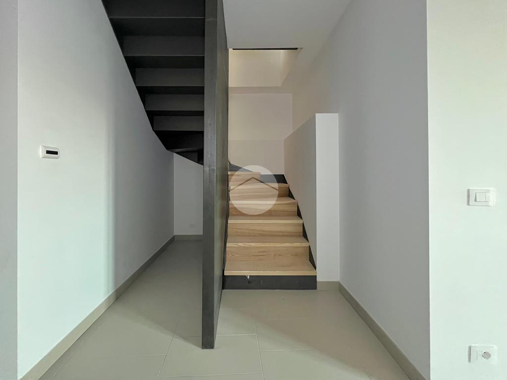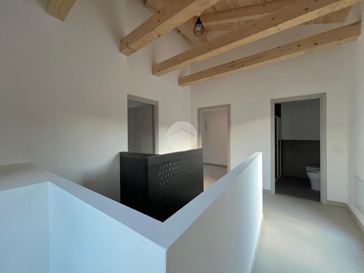 Una scala in legno conduce al secondo livello, dove si trovano due ambienti adibibili a camere da letto, un secondo bagno con doccia e l’accesso al terrazzo panoramico privato, ideale per momenti di relax all’aperto.