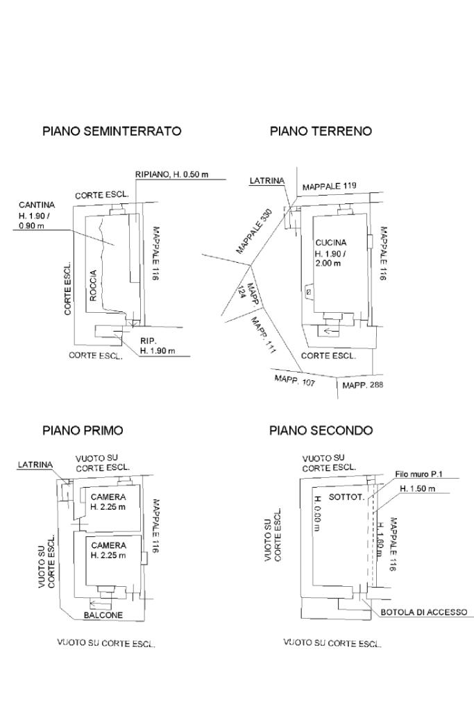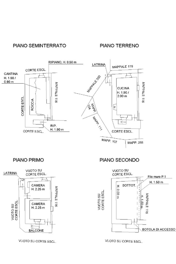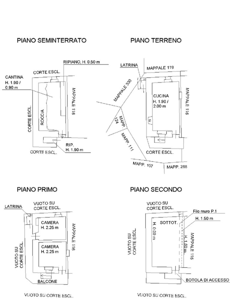 La casa si sviluppa su tre livelli: al piano seminterrato si trovano la cantina ed un piccolo sottoscala; il piano rialzato, avente soletta in muratura, è composto dalla cucina abitabile con camino a legna e doppia esposizione; passando per la scala esterna, ma coperta si sale al piano primo composto dalle due camere da letto.